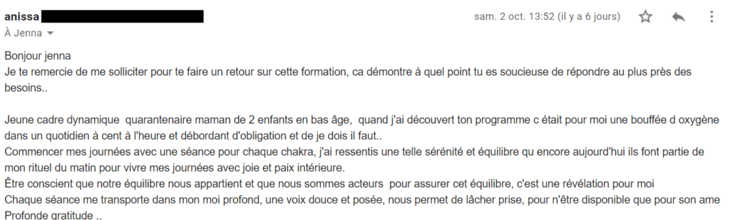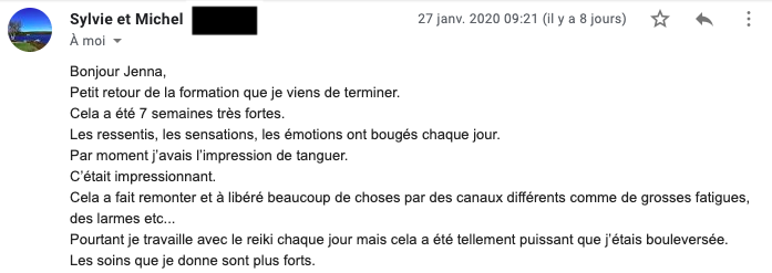 Jenna guide déjà depuis plusieurs années des centaines personnes de tous âges et de tous horizons (hommes, femmes, entrepreneurs, artistes, salariés…) et elle a créé de profondes transformations.
